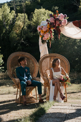 Je les ai accompagnés dans la conception globale du design de leur mariage, en les aidant à imaginer une ambiance cohérente, chaleureuse et fidèle à leur personnalité. Afin qu’ils puissent profiter pleinement de leur journée, j’ai également pris en charge la location du mobilier, pour leur offrir une organisation fluide et sans stress.